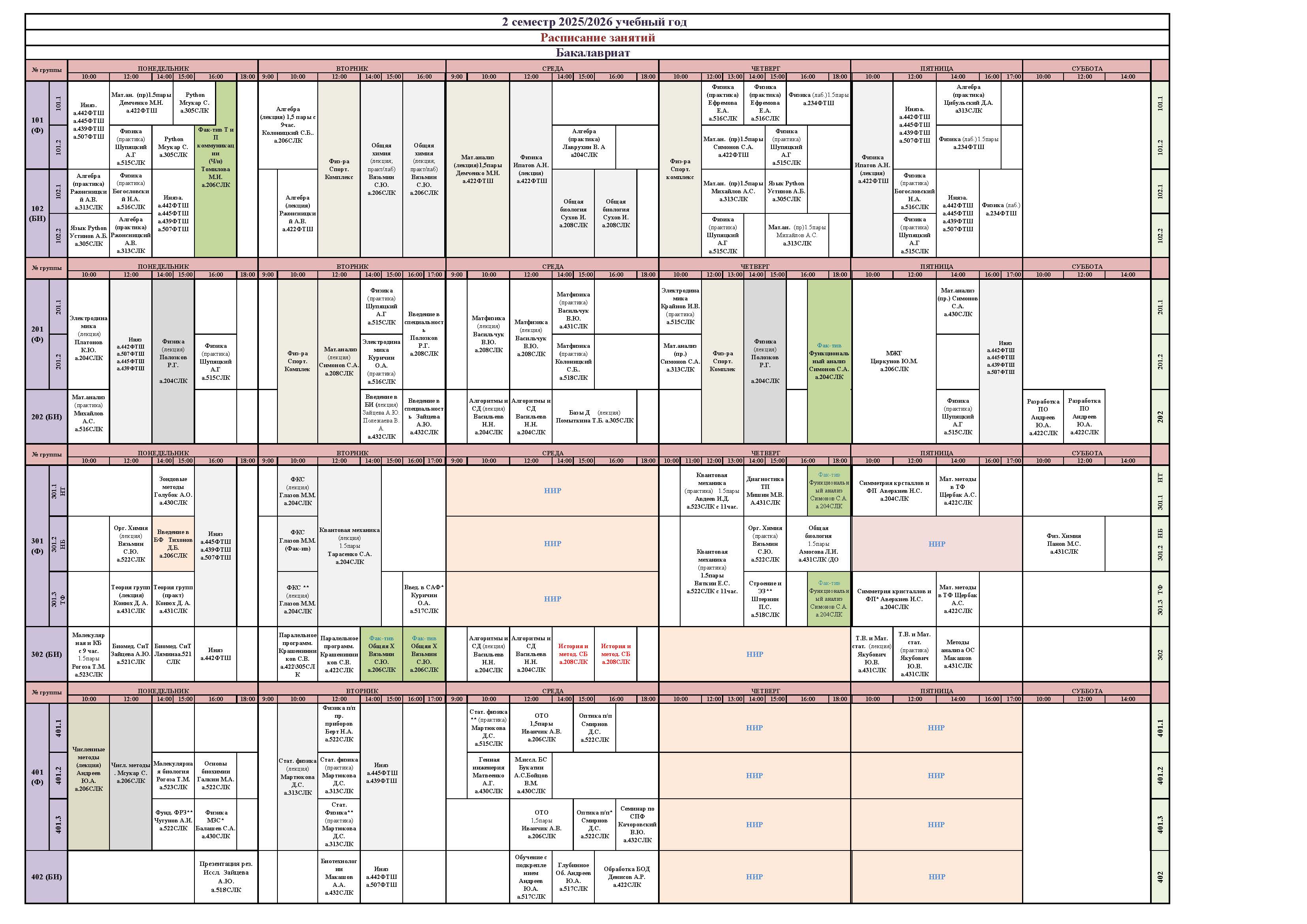 Расписание занятий студентов очной формы обучения на 2 семестр 2025-2026 учебного года