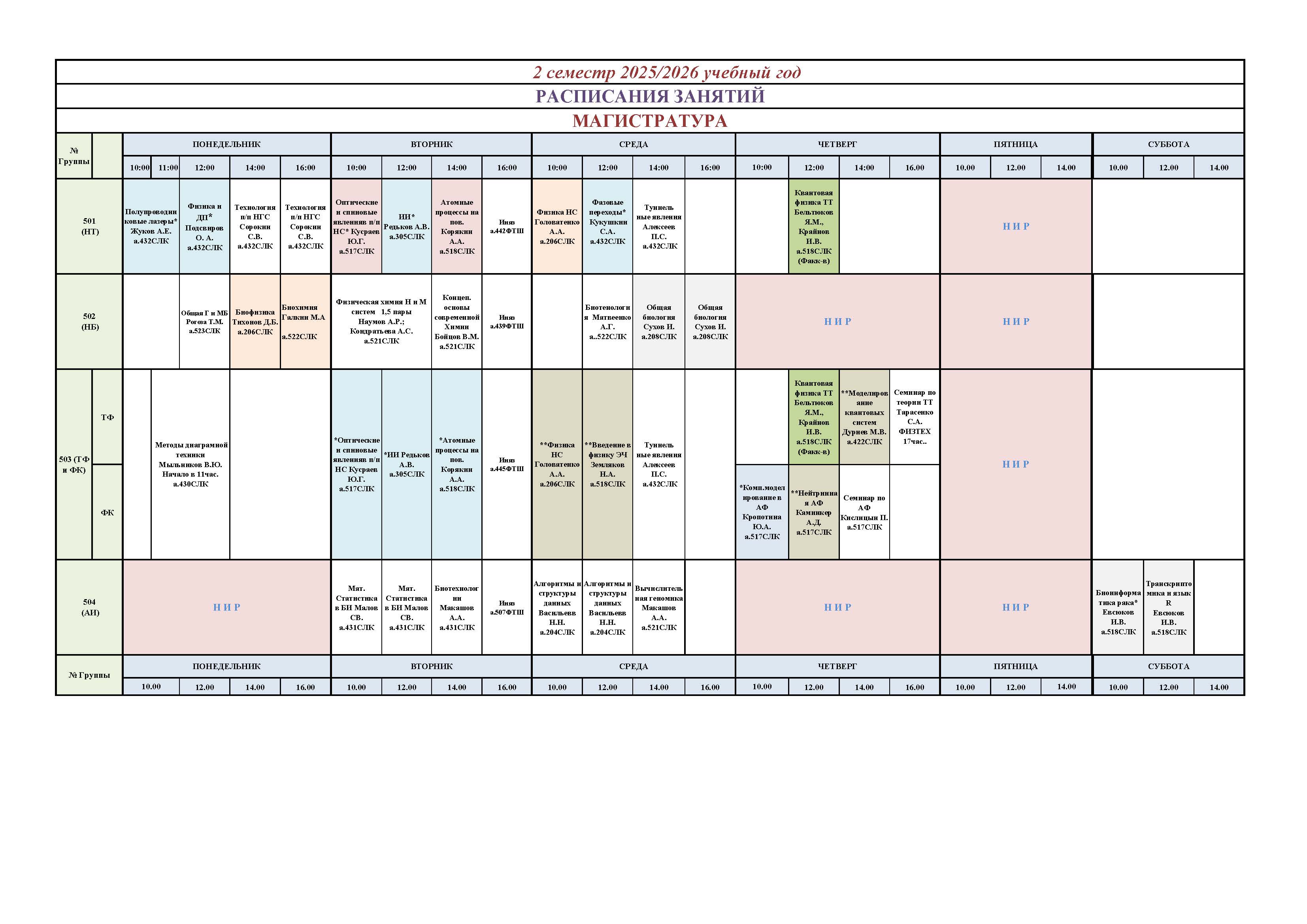 Расписание занятий студентов очной формы обучения  на 2 семестр 2025-2026 учебного года (магистратура)